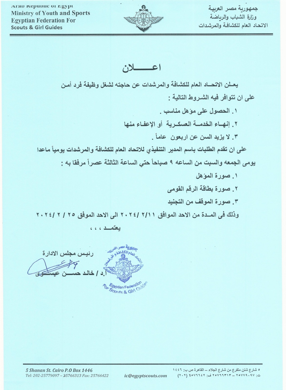 يعلن الاتحاد العام عن حاجته لشغل وظيفة فرد أمن علي ان تتوافر فيه الشروط التالية: