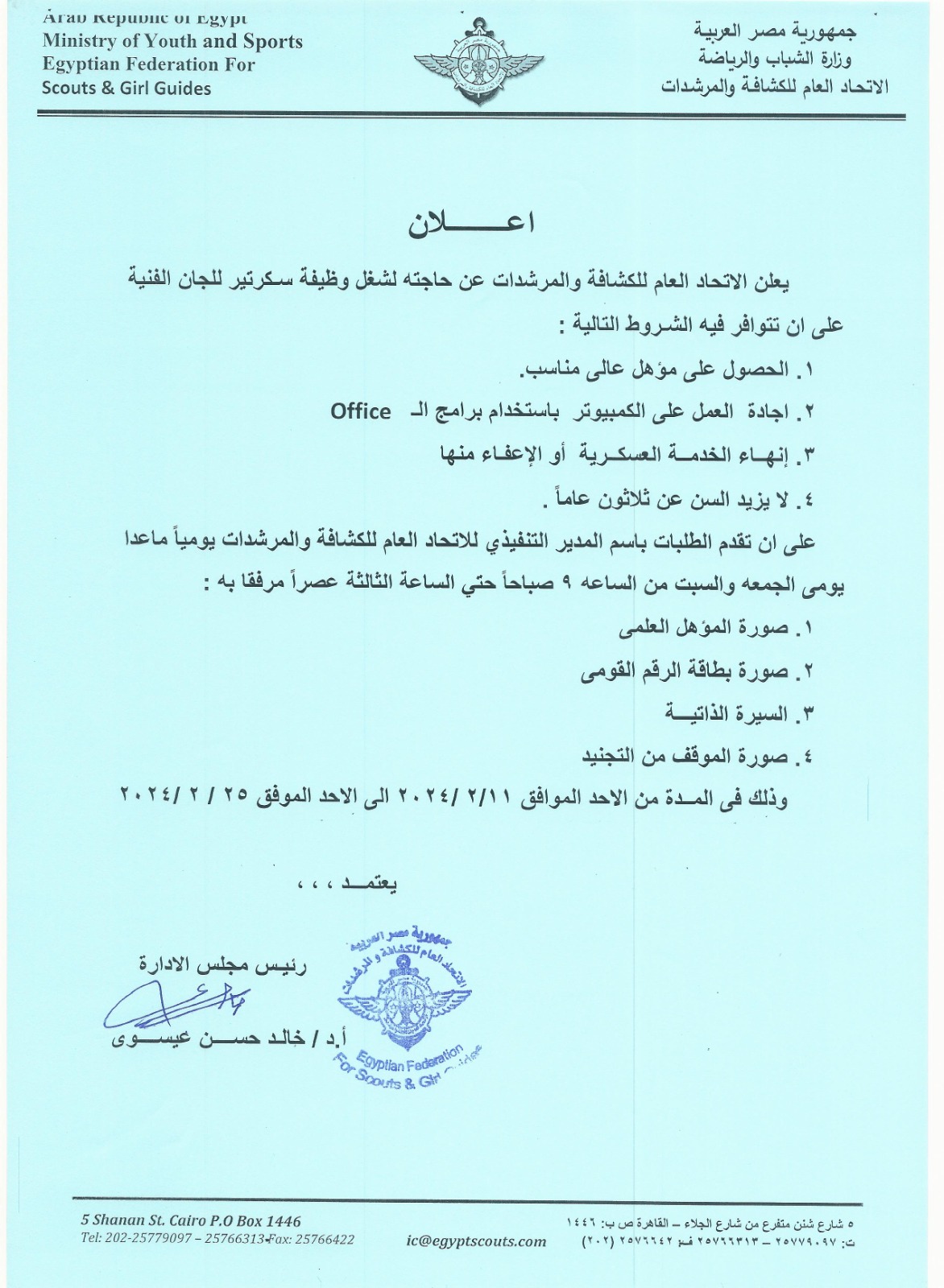 يعلن الاتحاد العام عن حاجته لشغل وظيفة سكرتير اللجان الفنية علي ان تتوافر فيه الشروط التالية: